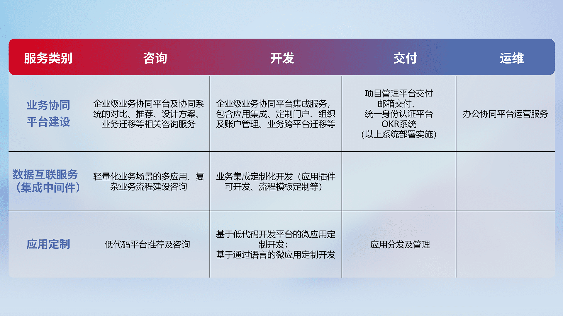 针对钉钉、、、、企微、、IDaas等平台级产品提供产品的规划、、方案、、、交付、、定制化开发等服务,,,实现如统一协同办公、、、、智能客户服务、、、混合会议管理、、智能数据查询、、、、等业务场景,,,实现数字化转型。。。。